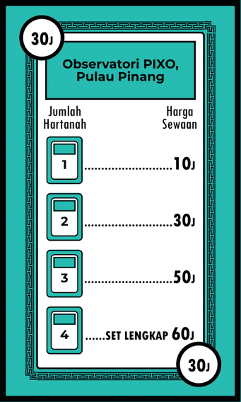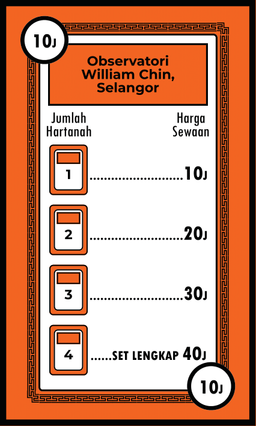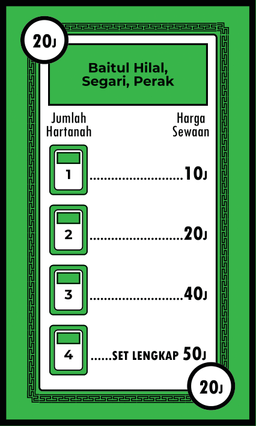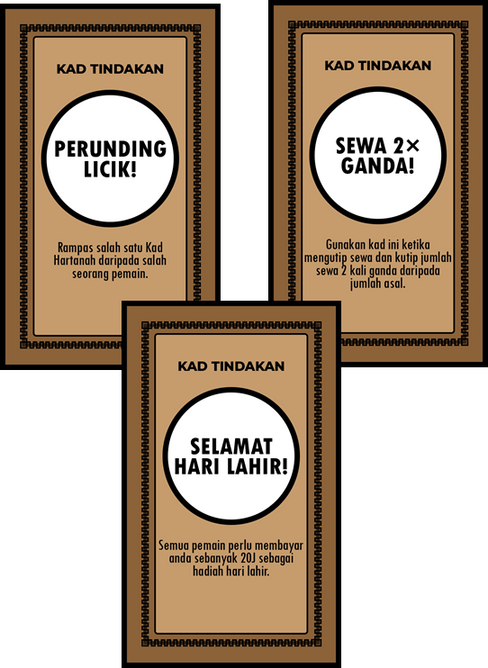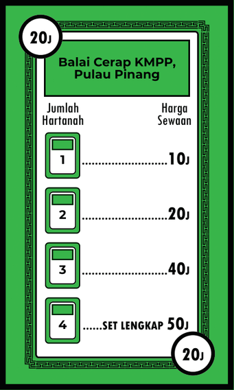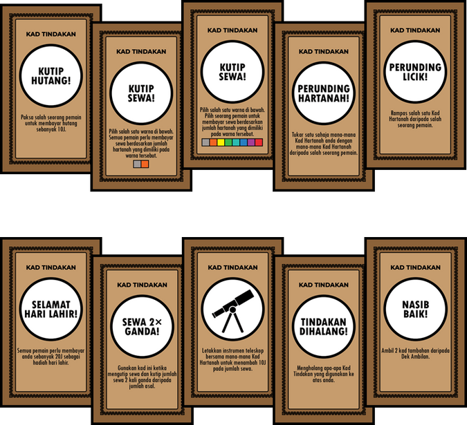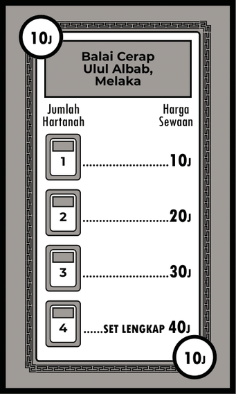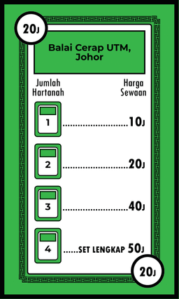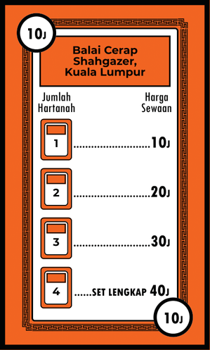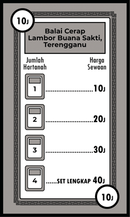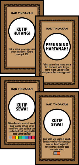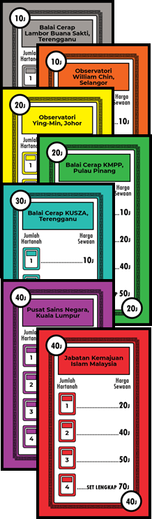 Setiap kad memaparkan nilai hartanah, jumlah hartanah dan nilai sewaan. Setiap set warna mempunyai 4 Kad Hartanah.