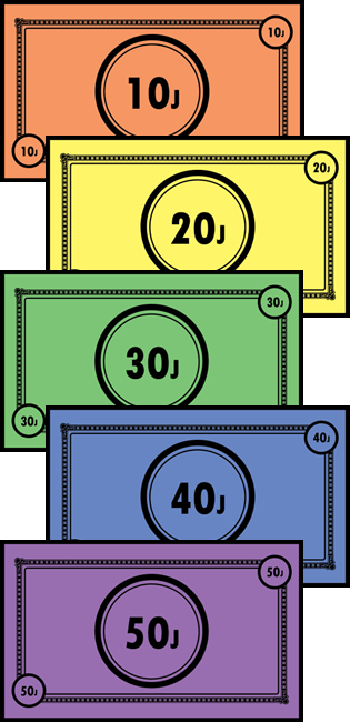 Setiap pemain akan mendapat 50J pada awal permainan. Agihkan 3 Kad Duit 10J dan